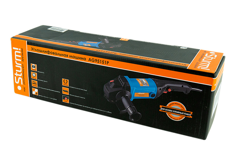 Sturm AG95151P – мощная универсальная болгарка (УШМ) под рабочий диаметр диска 150 мм. Имеет компоновку с длинной рукоятью, что обеспечивает удобство использования и лучший контроль инструмента при зачистных работах. Модель оснащена производительным 1400 ваттным электромотором, гарантирующий запас по мощности даже при энергоемких операциях и позволяющий использование различных типов оснастки, включая алмазные чашки для шлифовки по камню. Являясь представителем профессиональной серии инструмента Sturm, болгарка Sturm AG95151P обладает повышенными показателями по надежности и ресурсу, как за счет применения высококачественных комплектующих (фирменные подшипники C&U), так и благодаря продуманной, с запасом по прочности, конструкции : электромотор покрыт несколькими изоляционными слоями термостойкого лака и имеет защиту от пыли и абразивных частиц, благодаря закалке, повышенной износостойкостью обладают шестерни редуктора, в качестве опор вала шпинделя установлены шарикоподшипники, корпус инструмента изготовлен с использованием стойкого к ударам нейлона. Для дополнительного удобства пользователя, модель снабжена быстросъемным защитным кожухом, надежно фиксирующимся при помощи специального зажимного рычага. Предусмотрена возможность быстрого доступа к щеткам, упрощающая процесс их замены, так как исключает демонтаж элементов корпуса.