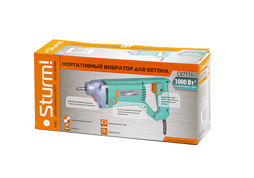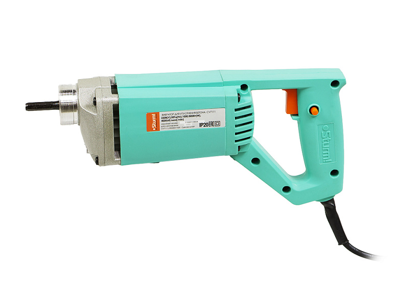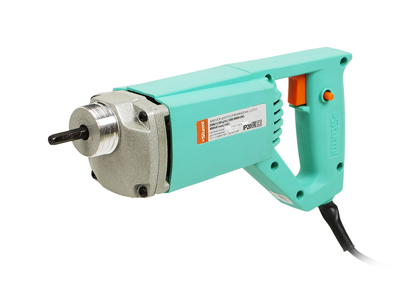 Sturm CV7111 – портативный вибратор для бетона – незаменимый помощник для заливки фундаментных оснований. Идеально подойдет как для ремонтных работ в частном секторе, так и при более широком применении на строительных площадках. Использование вибратора приводит к колебаниям бетонной массы, что в итоге обеспечивает лучшую сплоченность и однородность состава, избавляя его от пузырьков и ракушек –  за счет этого достигается достаточная прочность бетонной массы. Инструмент обладает относительно небольшими габаритными размерами и весом, благодаря чему удобен в работе. Корпус устройства изготовлен из прочного высококачественного пластика, стойкого к механическим повреждениям, что обеспечивает длительный срок службы инструмента. Металлический корпус редуктора способствует лучшему отводу тепла. Модель оснащена производительным двигателем мощностью 1000 Вт, позволяющим эффективную работу в тандеме с гибким валом длиной до 2.5 метров и диаметром булавы – 35 мм. Для удобства длительной работы предусмотрена возможность фиксации пусковой кнопки.