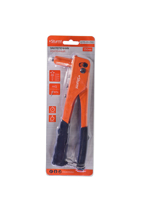 Заклепочник Sturm! 1070-01-250 является универсальным инструментом для соединения деталей из листового металла, ткани, кожи и пластика. Он поставляется с подпружиненной ручкой, которая выталкивает стержень заклепок. Корпус ручного заклепочника изготовлен из стали с нескользящими рукоятками и ключом для замены насадок. Комплектация включает 4 типа сменных головок: 3/32" (2,4 мм), 1/8" (3,2 мм), 5/32" (4,0 мм) и 3/16" (4,8 мм).