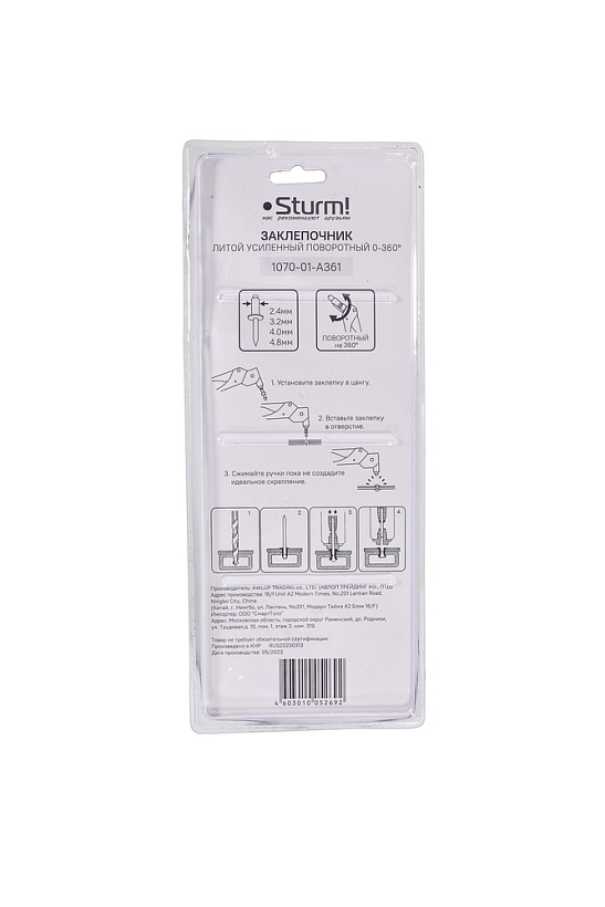 Заклепочник Sturm! 1070-01-A361 способен обрабатывать широкий спектр материалов, включая листовой металл, ткань, кожу и даже ремонт автомобилей. Этот простой в использовании заклепочник должен быть в наборе инструментов любого рабочего или мастера. Комплектация включает 4 типа сменных головок: 3/32" (2,4 мм), 1/8" (3,2 мм), 5/32" (4,0 мм) и 3/16" (4,8 мм).