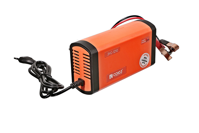 СОЮЗ ЗУС-1210 — портативное инверторное зарядное устройство. Предназначено для автоматической зарядки как классических свинцово-кислотных, так и AGM (технология Absorbent Glass Mat), а также гелевых (GEL) аккумуляторных батарей напряжением 12 В и емкостью от 30 до 100 Ач. Модель выполнена в компактном корпусе — благодаря своим минимальным габаритам очень удобна в хранении и транспортировке. Устройство предельно простое в эксплуатации и не требует специальных навыков — пользователю достаточно лишь подключить провода с зажимными клеммами к аккумулятору, соблюдая полярность, и включить прибор в сеть. Контролировать процесс зарядки помогает световая индикация: красный цвет индикатора — аккумулятор заряжается, зеленый цвет индикатора — аккумулятор уже заряжен. Ток зарядки СОЮЗ ЗУС-1210 составляет 10 А. Для обеспечения безопасности пользователя в случае любых внештатных ситуаций модель оснащена необходимым комплексом защиты: от перегрева, от короткого замыкания, от неверной полярности подключения.