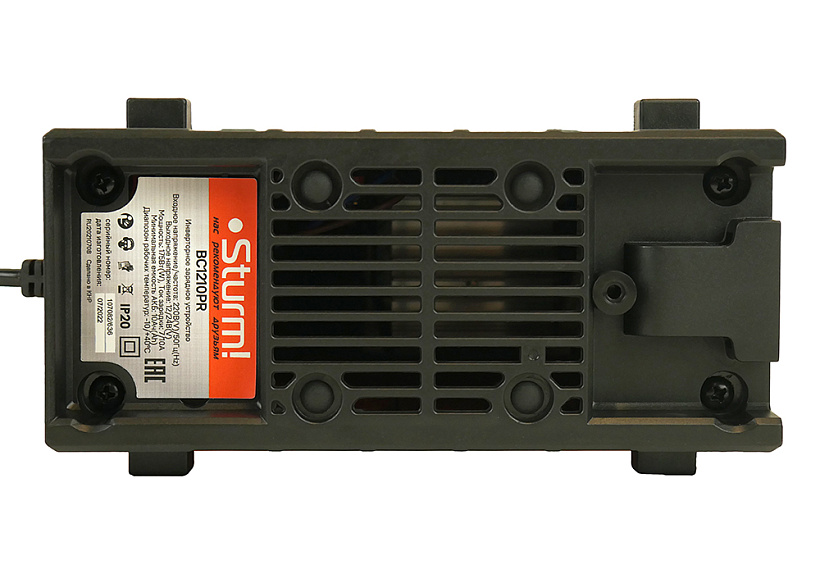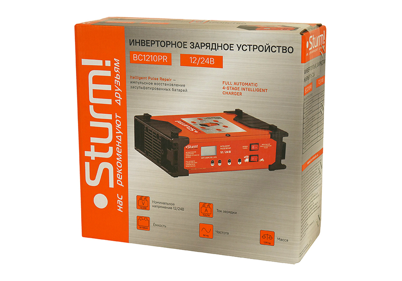 Sturm BC1210PR — современное универсальное автоматическое инверторное зарядное устройство. Предназначено для быстрой и эффективной зарядки практически любых видов аккумуляторных батарей (WET /AGM /GEL /EFB), напряжением 12 или 24 Вольта, емкостью от 10 до 100 Ач. Идентификация вида заряжаемого аккумулятора производится автоматически. Модель обладает небольшими габаритными размерами и массой, а также имеет металлический, стойкий к возможным механическим повреждениям, корпус — является оптимальным вариантом переносного высокомобильного устройства, максимально удобного при транспортировке и хранении. Прибор прост в эксплуатации и не вызовет трудностей в освоении. Удобство использования обеспечивает наличие большого дисплея, на который выводится все необходимая текущая информация о ходе процесса зарядки. Важная особенность модели — наличие режима автоматической бережной многоэтапной зарядки — устройство автоматически подбирает необходимую силу тока и продолжительность процесса заряда. Также предусмотрена функция импульсного восстановления для сильно разряженных аккумуляторных батарей. Для обеспечения безопасности пользователя в случае любых внештатных ситуаций прибор оснащен необходимым комплексом защиты: от перегрева, от короткого замыкания, от неверной полярности подключения. В комплект поставки входит также ремень для удобства перемещения.